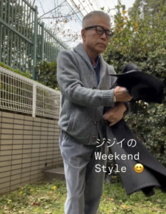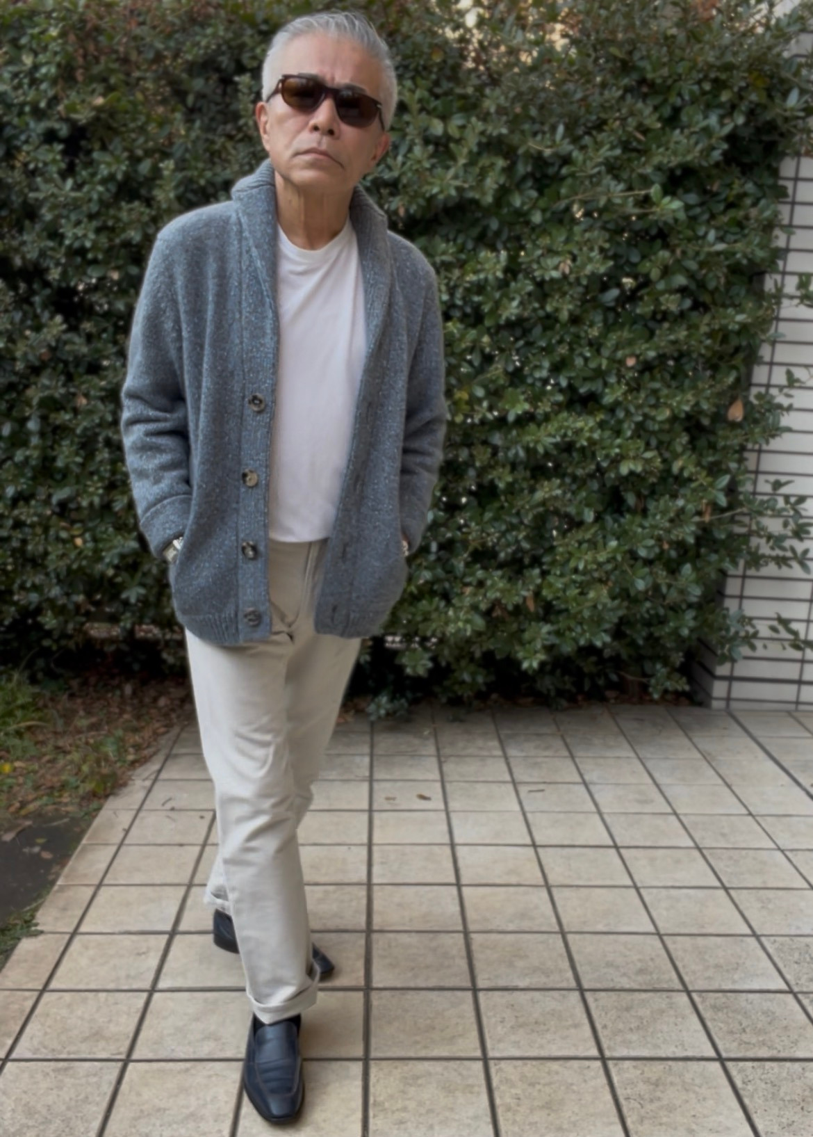 寒い時期にはショールカラー・カーディガンを愛用しています。でも、普通にこのアイテムは、やや年寄りくさくなるのが問題です。上の写真は、それを意識してジジ臭くならないコーディネイトを考えてみたものです。下の写真は、同じショールカラー・カーディガンですが、ジジイの年齢なり(今、63歳です)の雰囲気のコーディネイトをしたものですが、雰囲気が違いますよね。