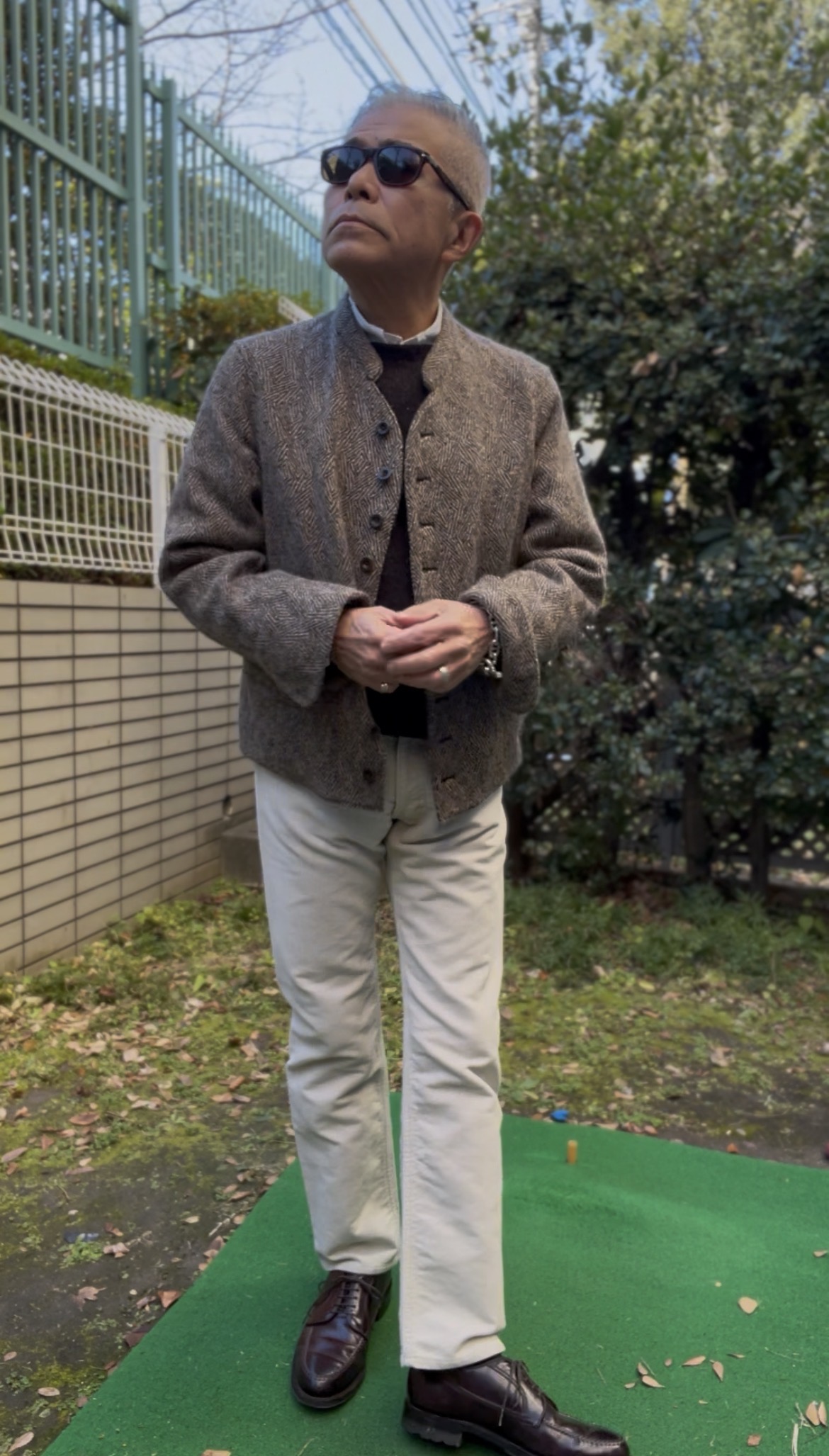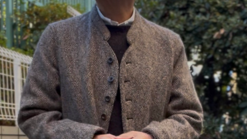 In today’s styling, I used all the items sold at Anatomica, except for the button-down shirt. The jacket is an Anatomica original dolman jacket. It’s made from Donegal tweed fabric by the Irish company MAGEE, and I love it because it’s a tasteful fabric and very comfortable to wear. This fabric is apparently called crazy herringbone.